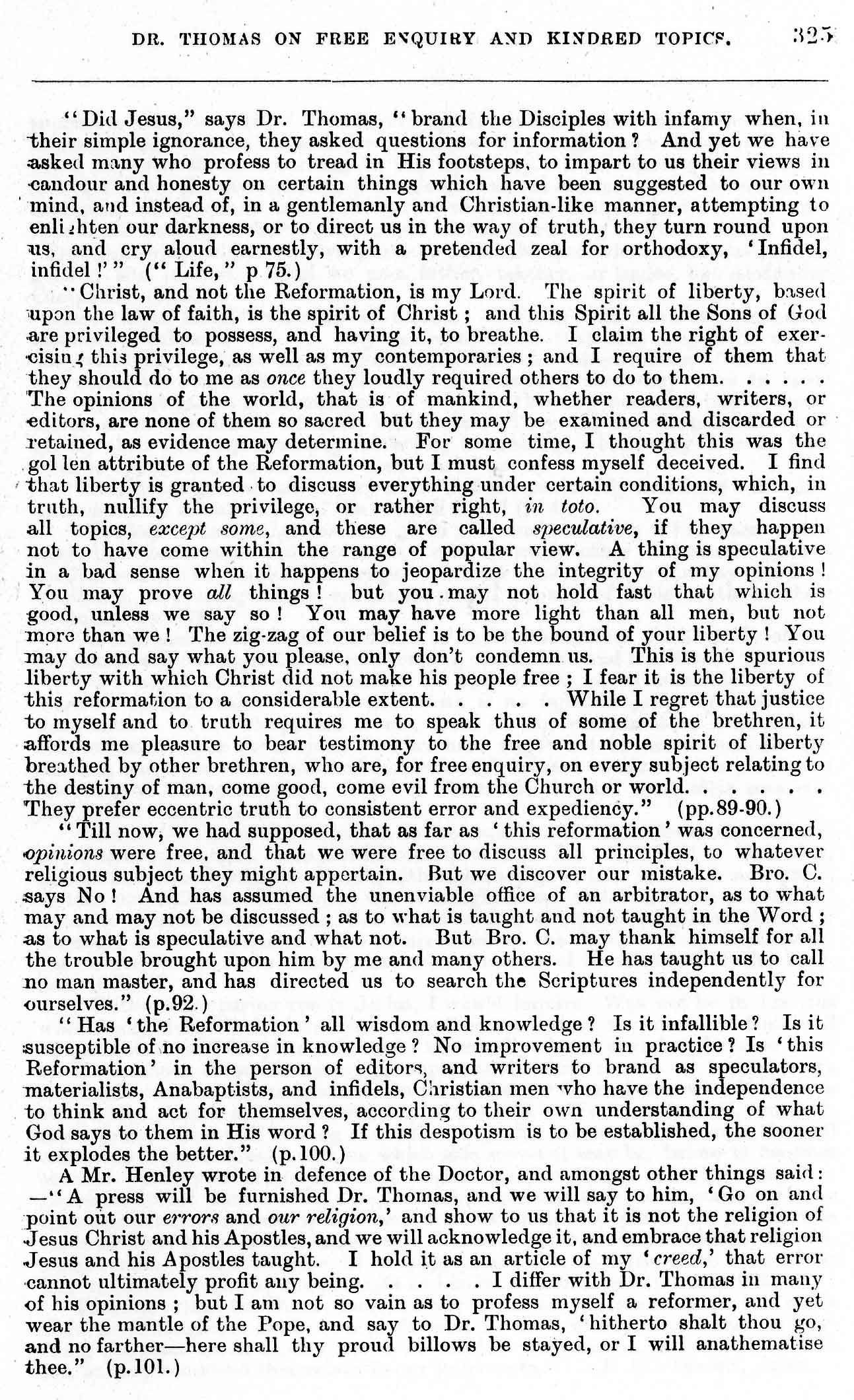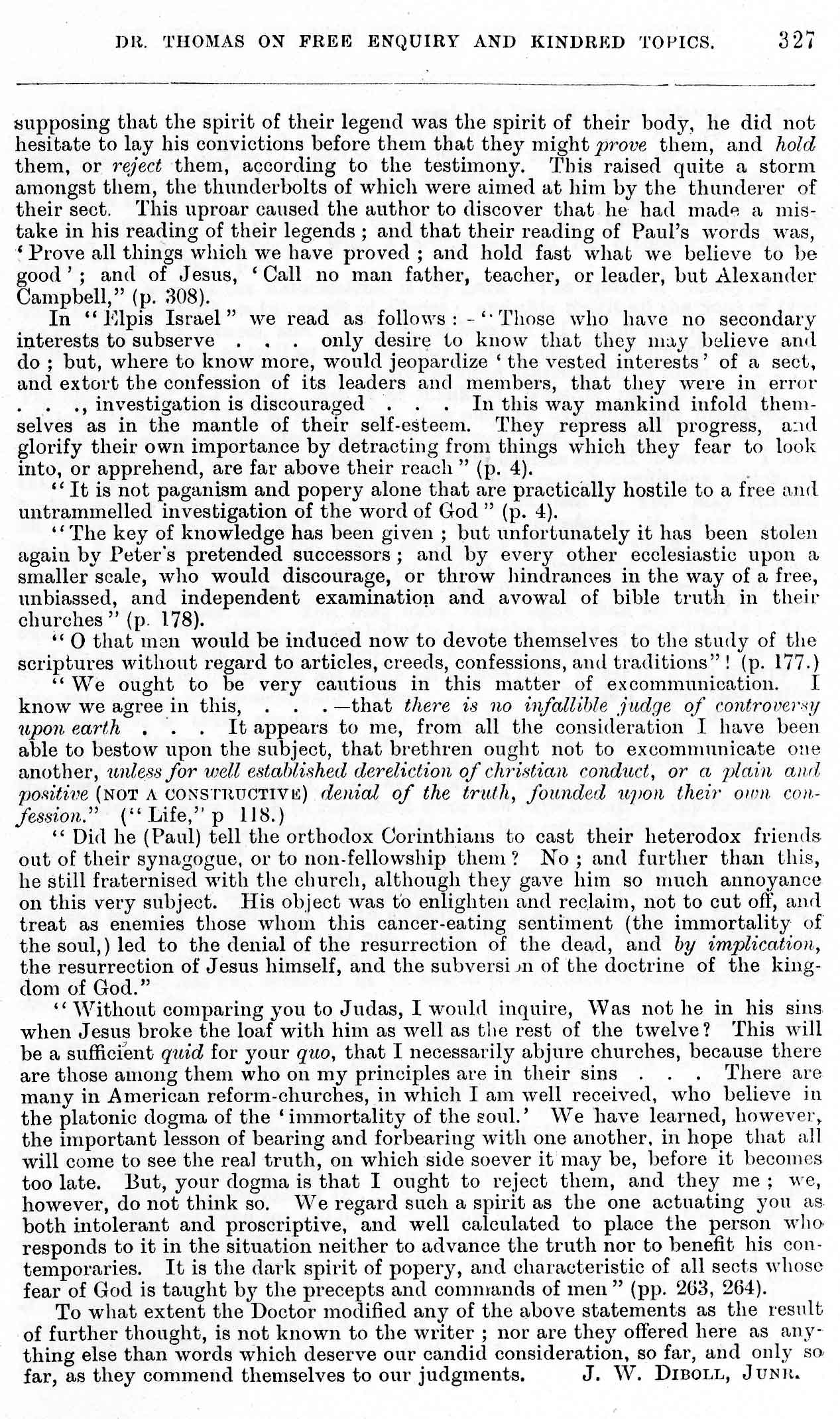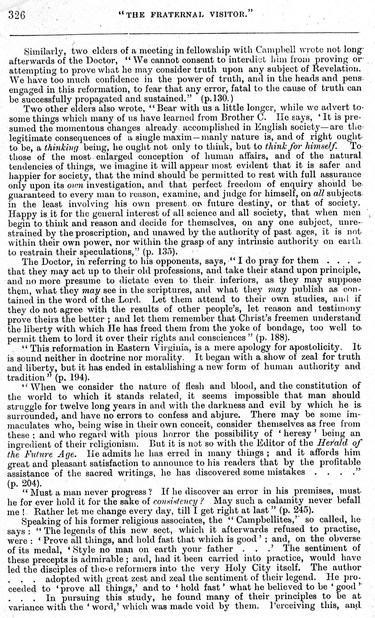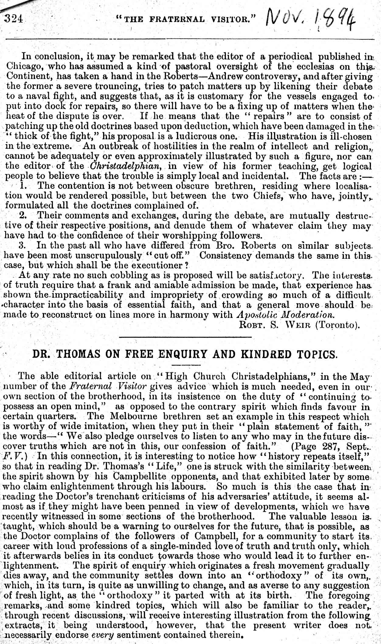 The following article is from the “Fraternal Visitor”, a Christadelphian magazine that was written in November 1894. The context was a division resulting from attempts to alter the main Christadelphian statement of faith that was in use at that time. It reflected concerns that had simmered since other attempts to impose more creedal requirements into the movement and a sense that there was an authoritarianism of approach by a man who had become de facto leader of the organisation, Robert Roberts. It quotes the founder of the movement, John Thomas and the ethos that had initially been promoted by the movement. It should be noted that quotes by him later in life had moved away from some of this early emphasis, which was not embraced by all the people who joined early on.